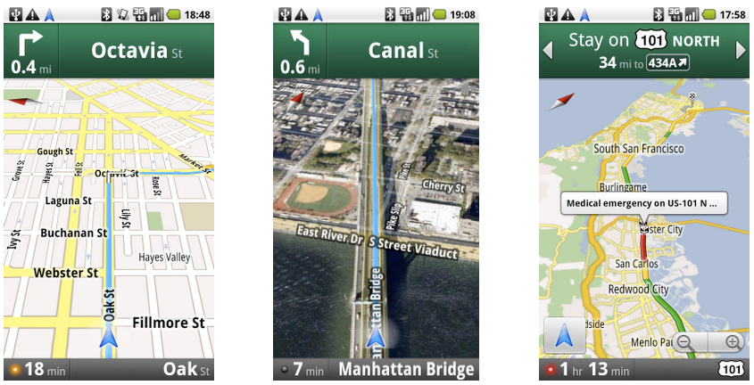 October 28, 2009. Google announces that Android 2.0 will include free turn-by-turn navigation inside Google Maps. Voice-guided. Real-time traffic. Automatic rerouting. Free.